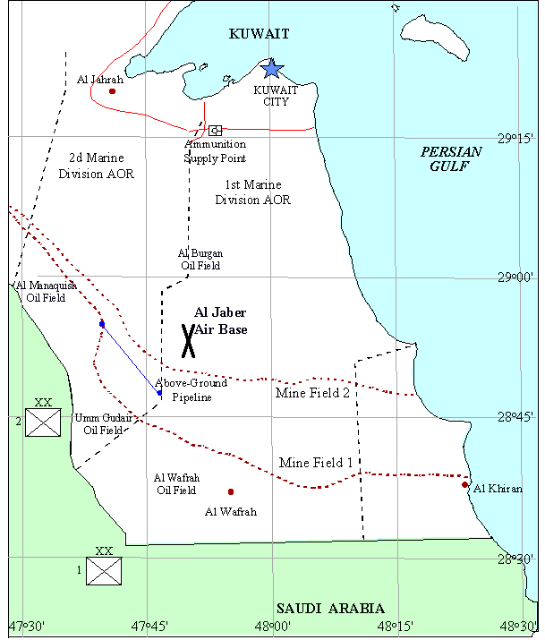 The 1st and 2d Marine Divisions, the ground maneuver elements of the First Marine Expeditionary Force (I MEF), were positioned along the northern boundary of Saudi Arabia with the mission to attack north into Kuwait. The I MEF was tasked to breach (clear openings in) two heavily defended minefield belts,[2] advance past Ahmed Al Jaber air base taking key sites along the way, and converge on Kuwait City to liberate the capital. The areas of operations are shown in Figure 2. The 1st Marine Division eventually opened 14 lanes; the 2d Marine Division opened six.[3]