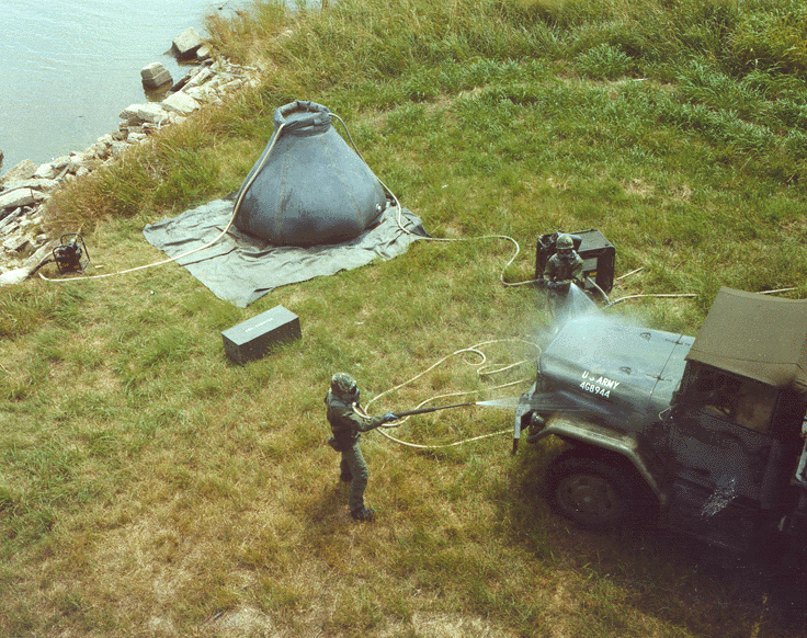 Figure 19. Soldiers in training use a SenatorTM to decontaminate a vehicle.