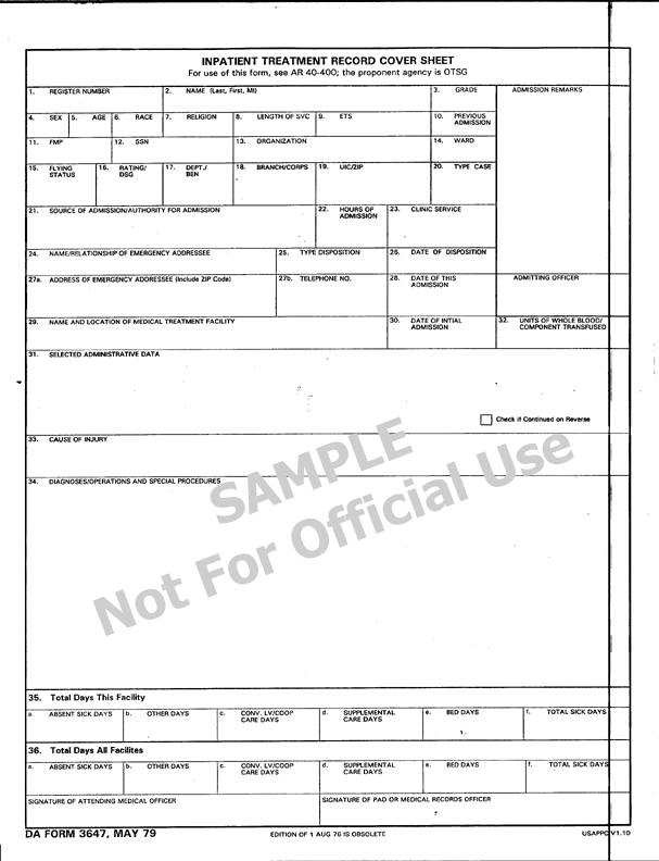 DA 3647: Inpatient Treatment Record Cover Sheet, May 1979