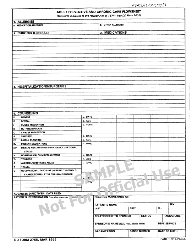 DD 2766: Adult Preventive and Chronic Care Flowsheet (page 1), March 1998