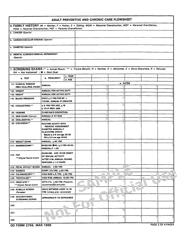 DD 2766: Adult Preventive and Chronic Care Flowsheet (page 2), March 1998