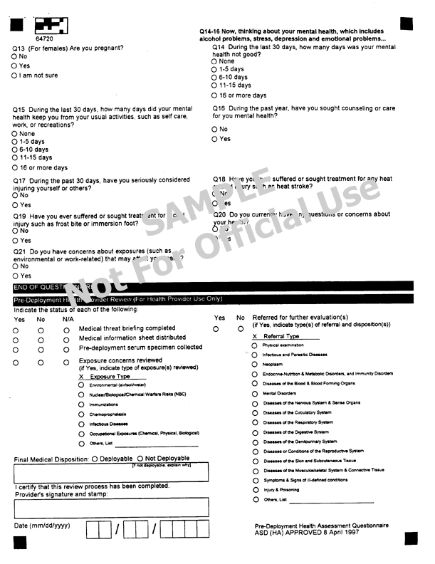 Initial Pre- Deployement Health Assessment Questionnaire (back), April 1997