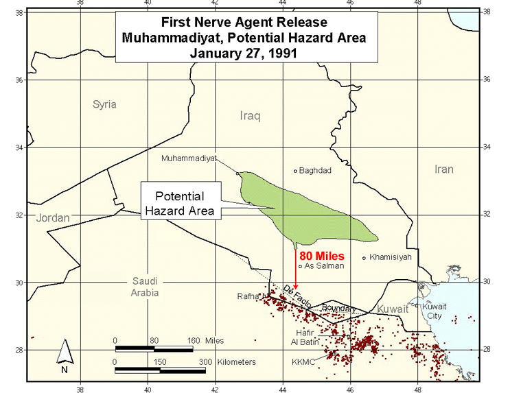 Figure 10. Closest approach of nerve agent hazard area to main concentration of US forces in Saudi Arabia