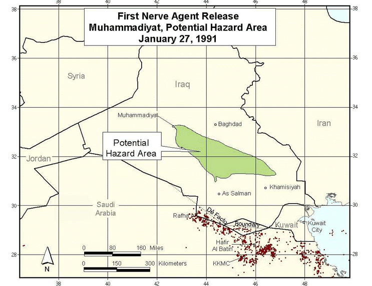 Figure 21. First Nerve Agent Release, Muhammadiyat, Potential Hazard Area, January 27, 1991.