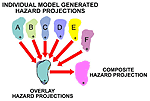 The IDA technical review panel hypothesized that because of the uncertainty of modeling and the consistency of the simulations, each simulations results are equally likely to accurately reflect what really may have occurred.[103] Therefore, we combined all hazard projections generated by HPAC or VLSTRACK to create a single hazard area combining all exposure areas from all dispersion model runs. This approach assures a high probability that the exposure area includes all units possibly exposed. Figure 15 depicts the process for creating a composite hazard projection.