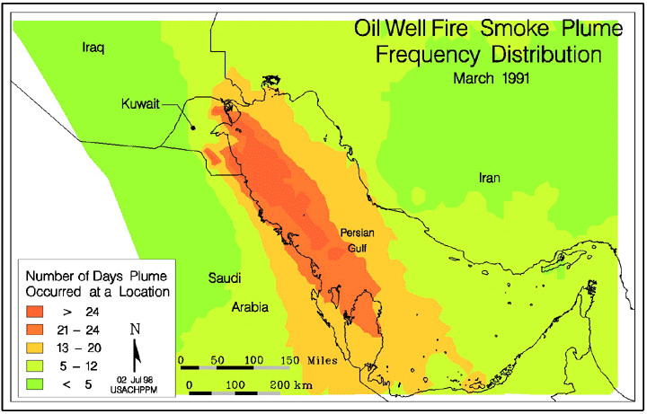 In the map below, the extreme red portion of the plume boundary is over the northeast corner, south, and southeast corner of Kuwait, and extends southeastward over the Persian Gulf.