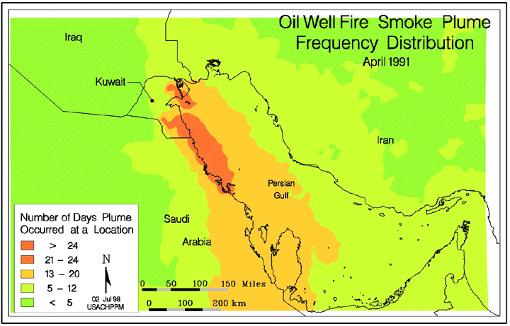 In the map below, the extreme red shading indicates that the smoke plume was over the northeast and southeast corners of Kuwait for a period greater than 24 days. The general wind direction of northwest to southeast drives the distribution pattern for the April time period. Coastal areas in Kuwait and Saudi Arabia were affected by the presence of the plume for the greater period of time.