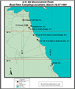 Real-time measurements (i.e., levels were obtained at the time samples were taken) of H2S, SO2, VOCs, and TSP were obtained using portable equipment. Initial monitoring in Kuwait and Saudi Arabia was carried out between March 13 and March 20, 1991, at 13 locations. These included the Meteorology and Environmental Protection Administration (MEPA) in Dhahran, Saudi Arabia; the US Embassies in Kuwait City and Riyadh, Saudi Arabia; Camp Freedom in Kuwait; Port Shuaybah in Kuwait; and several locations near the oil fields. A second round of monitoring was conducted between March 24 and March 27, 1991, at about 15 locations in Kuwait.[134] Figure 7 identifies the USIAATs sampling/monitoring locations.[135] Like the USAEHA monitoring that was to follow, these sites were selected to obtain real-time data in areas where US troops were located.