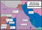The pollutant-specific concentration data consisted of sampling/monitoring results from fixed site sampling locations in Kuwait and Saudi Arabia. Sampling site locations were established based on their proximity to where a majority of US troops were located for extended periods of time during and after the war, and included areas where the smoke was considered heaviest. Sampling was conducted at seven major troop sites and three non-troop sites (i.e., US Embassy in Kuwait, the Ahmadi Hospital, and Camp Abdaly Red Cross/Red Crescent Refugee Center).[155] A sampling point location map is presented in Figure 8. US EPA standard methods were used in measuring pollutants. A description of these methods can be found in the USAEHA Final Report.