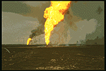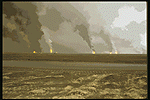 Although the composite smoke plume from the fires appeared to be black when viewed from satellite photographs, smoke color and density varied in individual fires. About 25% of the plumes from individual fires were observed to emit white or light gray smoke, while others emitted black or a mixture of black and white smoke.[106] Fires that produced white smoke were found to be highly enriched with sodium and calcium chlorides.[107] (See Photo 5). About 10% of the fires were from the oil lakes that produced the densest black smoke (see Photo 6). Photo 7 shows an oil lake that is not burning. In this photograph a pool of oil surrounds a "Christmas Tree" valve. A few of the fires emitted no visible plume at all. The differences in plume composition were the result of variations in the oil/gas/water mixture of the oil ejected from the wells, the compositional differences between the different oil fields, and the condition of the damaged well heads.[108]