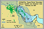 In addition to its use in data integration and risk calculations, the GIS has the capability to develop geographic comparisons between troop unit locations with respect to the boundary of the consolidated "super plume" over time. Figures 11 and 12[213] allow for a qualitative comparison of where individual troop units were with respect to plume boundary location on February 24 and 28, 1991(the first and last day of the ground war). The comparison is qualitative in the sense that the units shown in the figures are not uniquely identified on each map and exposure parameters, such as contaminant concentrations are not specified within the plume boundary.