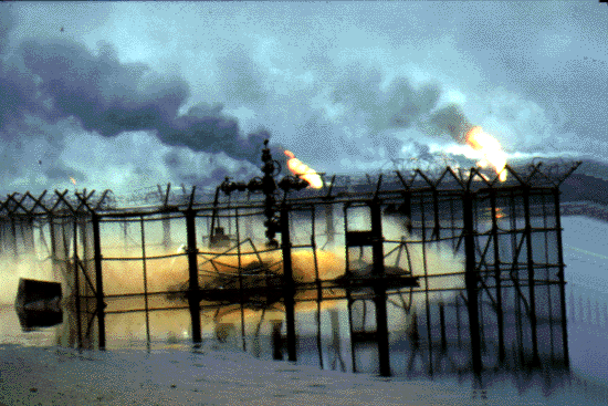 Figure 17. Oil lake around a ruptured "Christmas Tree" valve (� 1996 Earthbase/Liaison Agency reprinted with permission)