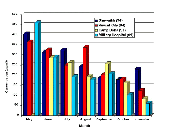 Figure 19. Respirable particulate matter (PM10) comparisons in Kuwait (1991 and 1994)