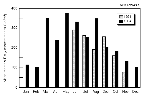Figure 4.1--Mean Monthly Concentrations of PM10 in Camp Thunderock, Doha, Kuwait, in 1991 and in Kuwait City in 1994