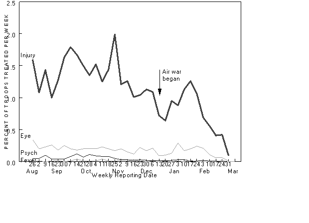 Gulf war. As a result, the disease non-battle injury (DNBI) rate during this war was lower