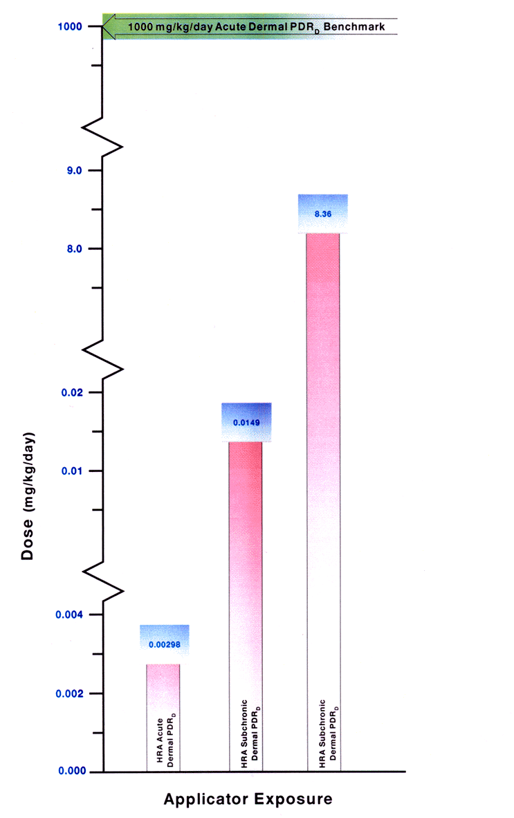 | Comparative representation of published human health risk to the HRA route-specific dose estimates. The above graph represents the lowest concentration of Propoxur at which human health effects occur in the literature compared to the HRA estimated exposure of Gulf War servicemembers. The arrow represents the most conservative NOEL for acute dermal exposure route from the human health effects studies. This level can then be compared to the exposure route that had the highest reported HRA dose estimate for all exposure levels. |
