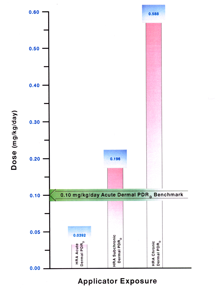 | Comparative representation of published human health risk to the HRA route-specific dose estimates. The above graph represents the lowest concentration of Bendiocarb at which human health effects occur in the literature compared to the HRA estimated exposure of Gulf War servicemembers. The arrow represents the most conservative LOEL for acute dermal exposure route from the human health effects studies. This level can then be compared to the exposure route that had the highest reported HRA dose estimate for all exposure levels. |
