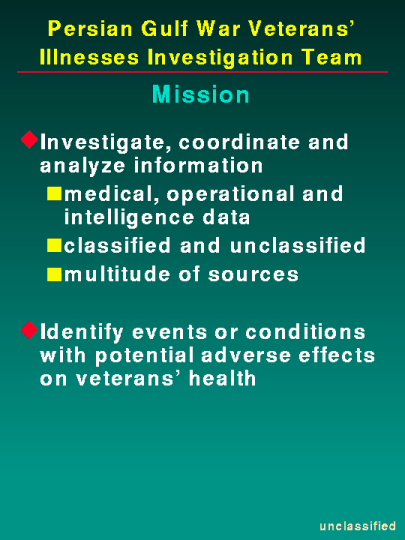 The Persian Gulf War Veterans' Illnesses Investigation Team is striving to fulfill its mission of identifying the underlying causes associated with the veterans' illnesses. We have tried not to become focused on any one specific issue. If we did, we might miss an opportunity to discover a new and valuable piece of information. This piece of information might be the key to solving the puzzle of Persian Gulf War veterans illnesses. Thank you for this opportunity to present the Team's efforts to date.