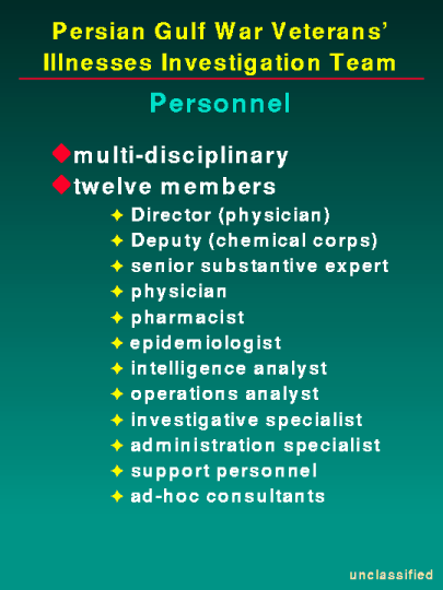 We would like to point out that although there are teams within the Department of Defense involved in the clinical and research aspects of Persian Gulf illnesses, we are the only team dedicated to the actual overall investigation, coordination and analysis of information on this issue. Therefore, in addition to our primary mission, we have many additional responsibilities which we listed in the packet we provided.