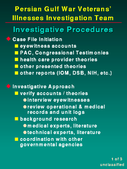 As you can see, the actual procedures required for each case file are unique to that case. Medical hypotheses, toxicological and conditional investigations require significant reviews of the medical literature. Incident or event investigations, such as Khamisiyah, require substantial resources dedicated to review intelligence and operational records, as well as identifying, locating and interviewing eyewitnesses. Team members have traveled to obtain information on a first hand basis; to Kuwait, to individual units and to technical experts in the fields being investigated. We consult the subject matter authorities, both within the Department of Defense and the civilian sector, to assist us with their expertise or to analyze information and samples.