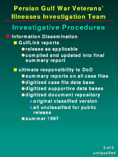 In addition to a final report, our Team has an electronic archive system which is being constructed. This archive will house the collection of our computerized investigation case management system, other supportive data bases, and the document repository of Persian Gulf War Veterans' Illnesses health-related documents. This amassing of data will conclude the summer of 1997.