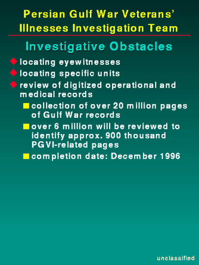 Obstacles to our investigative efforts revolve around three primary issues. First is the inability to locate individuals for interview purposes. The Defense Manpower Data Center, Monterey, California maintains a data base of service member's last known addresses. This address is current at the time of the member's discharge from active duty or separation from the reserves or national guard. If the service member has remained on active duty or is a drilling reservist or guardsman, they are considerably easier to locate and contact. Nevertheless, you can imagine the time spent to locate a veteran who separated immediately after returning from the Persian Gulf War. The second difficulty is the determination of unit locations during the war. During our investigation of a particular incident, the identification of all units, their location during a specific time period and subsequently all the personnel assigned to those units is very time consuming. Once the Environmental Support Group (ESG) data base becomes available, this part of our investigation should be accomplished more rapidly. Our last obstacle deals with the lag time associated with the declassification and digitization of Persian Gulf War Illnesses related documents. Until all record processing is accomplished in December 1996, our investigations remain incomplete. It would be a disservice if we closed a case file and the last piece of paper digitized contained key information relating to Persian Gulf War illnesses. Therefore, our investigative efforts will continue until proper analysis of all digitized documents is accomplished. At this time I will turn the testimony over to Lieutenant Moldenhauer.