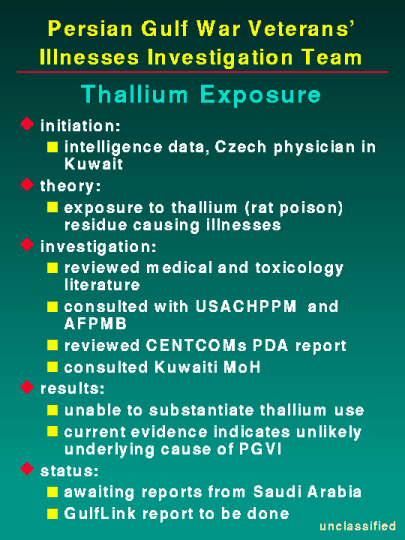 Your staff has requested we discuss the thallium toxicology case file. We identified the thallium exposure theory during a review of the declassified intelligence information released on GulfLink. A civilian physician employed by the Kuwaiti government from 1978 to 1983, recalls a use of thallium rat poisons sometime during 1980 or 1981. He recalls the hospitalization of many Kuwaiti civilians having the same symptoms as Persian Gulf War veterans. He proposed that thallium residue in the soil was dispersed into the atmosphere during the extensive military operations in Kuwait. In a review of the medical and toxicological literature (OSHA, EPA, Poisindex, ATSDR), thallium exposure does produce some symptoms similar to those seen in Persian Gulf veterans. These symptoms, such as fatigue, mood changes, pain in the legs or arms, hair loss, and peripheral neuropathy, may occur some time after exposure and last for months or years. The Team consulted members of the Armed Forces Pest Management Board to determine if U.S. forces used thallium rat poisons during Operation Desert Shield/Storm. The Pest Management Board stated that U.S. Forces used only anticoagulant-based, not thallium-based rodenticides. Thallium was an item of interest during Operation Vigilant Warrior '94. CENTCOMs Problem Definition and Assessment (PDA) Team, comprised of infectious disease, epidemiology, laboratory and environmental and occupational health experts, conducted soil and air sampling and discussed the issue with the Kuwaiti Ministry of Health. The U.S. Army Center for Health Promotion and Preventive Medicine performed the soil sample analyses and found no thallium present. The Kuwaiti Ministry of Health stated that thallium rodenticides were not used. We are investigating the possible Saudi Arabian use of thallium rodenticides, even though the soil samples tested were negative. Although the symptoms of Persian Gulf illnesses mimic that of thallium exposure, we are unable to substantiate the claims of thallium use or presence in Kuwait prior to or during Operation Desert Shield/Storm. Therefore, current evidence does not support the theory that thallium is an underlying cause of veterans' illnesses.