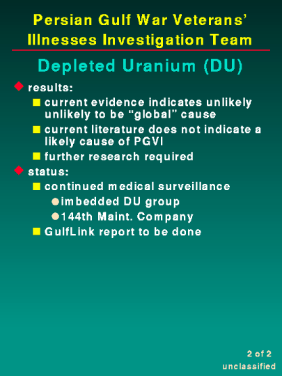 The net result of our investigative effort is that current literature and research do not indicate that DU is a likely cause of Persian Gulf illnesses. It is evident that many soldiers were around vehicles destroyed by DU munitions without taking proper protective measures. Additional research is definitely required. The Baltimore VA is currently following approximately thirty veterans with imbedded DU fragments and the Boston VA is following approximately twenty-five veterans of the U.S. Army 144th Maintenance Company. The latter unit was responsible for the recovery of DU contaminated vehicles and may have been exposed to breathable DU dust. To date, no evidence has been found to connect DU exposure to physiologic changes in these patients. The Team will continue our monitoring of the research efforts of these two study groups.