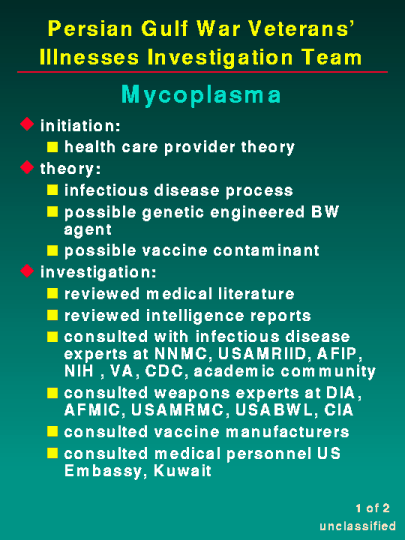 The Team's file category labeled Medical Policy and Clinical Issues deals with health care provider theories. The Committee staff requested that we discuss two of these case files: mycoplasma and delayed neurotoxicity. The mycoplasma case file being investigated by the Team is multi-faceted. Mycoplasma, a microorganism, has been proposed as an infectious disease in Persian Gulf veterans. Also presented was a theory that mycoplasma were intentionally genetically manipulated, thus implying an offensive weapon technology. Finally, it has been proposed that mycoplasma was a contaminant in the vaccinations given to U.S. forces. In order to effectively investigate each of these theories, this case file was divided into several facets.