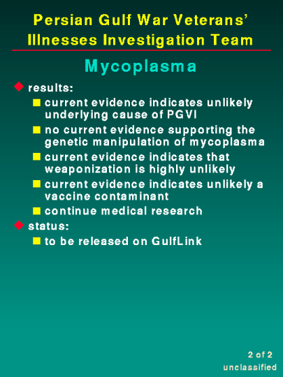 After all literature reviews and expert consultations, there does not exist enough substantial evidence to support any theory linking mycoplasma to Persian Gulf illnesses. We also find no evidence to suggest that the mycoplasma described is the result of biological warfare research. Since mycoplasma is endemic in the area, medical research should continue.