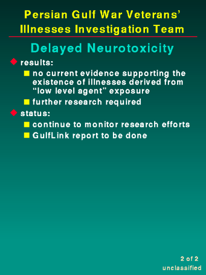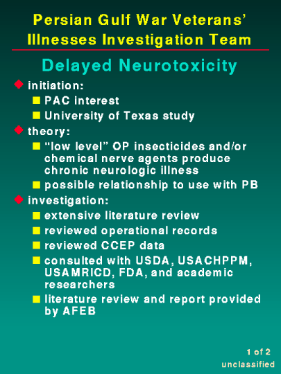 The issue of delayed neurotoxicity is being investigated as a result of the work being done at the University of Texas. The theory behind delayed neurotoxicity, more precisely identified as organophosphate-induced delayed neurotoxity, relates to "low level" exposures to organophosphate insecticides and/or chemical warfare nerve agents. This "low level" exposure is theorized as being able to produce chronic neurological symptoms similar to those exhibited in Persian Gulf veterans. The University of Texas study also attempts to link this "low level" exposure and concomitant use of pyridostigmine bromide. We have done an extensive review of the medical literature and available operational data. The Team also studied the Armed Forces Epidemiological Board literature review and report of information on this subject. We have reviewed the CCEP data and consulted with experts within the Department of Defense, federal government and academic research community.