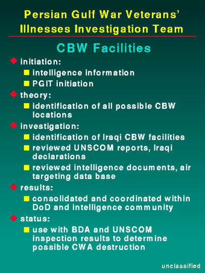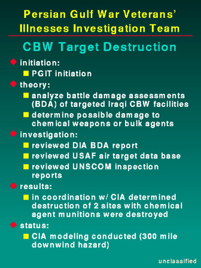 As we have testified in the past, we are examining the possibility of low level chemical agent exposure from several perspectives. We are examining the possibility that chemical agents were released as fallout from coalition bombing of Iraqi chemical production and storage facilities or by ground force destruction of chemical munitions sites. We are continuing to work closely with CIA in this effort. Air targeting and battle damage assessments of suspected chemical facilities have been compared to post-war UNSCOM inspections of these suspected sites. As CIA previously reported to you, munitions or bulk chemical agents at only three sites were destroyed by coalition forces. These sites are Muhammidiyat and Al Muthanna during the air war and Khamisiyah.