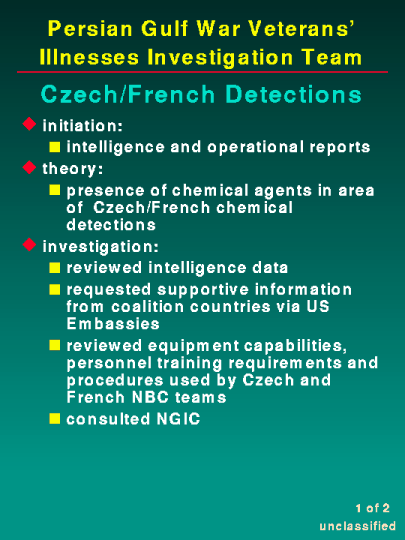 As stated in prior testimony, based upon the information available at this time, the available evidence indicates that the Czech detections of 19 and 24 January 1991 are credible. The other Czech and French reports are unsubstantiated, although they cannot be discounted. The reported mustard agent detection of 24 January 1991 still remains unresolved in the absence of any evidence of an attack. Our report on the Czech/French detections is complete and will be released on GulfLink soon.