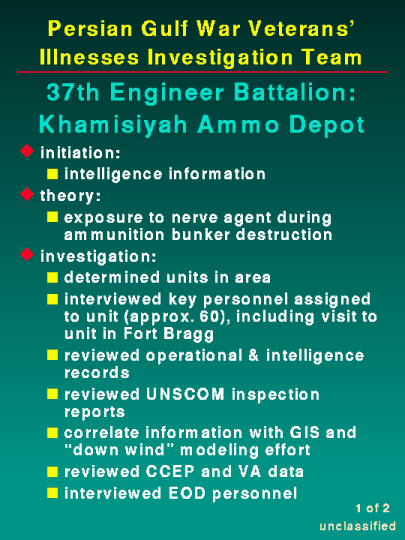 To shift gears slightly, the following slides address several case file updates requested by members of your staff. As mentioned earlier in our testimony, there are times when case files are grouped together, all relating to one issue, in this case "Low Level" Chemical Exposure. The case files shown build upon or are supportive of each other. For today's testimony, I will update the chemical and biological warfare facilities and target destruction, the Czech/French detections and the 37th Engineer Battalion: Khamisiyah Ammunition Depot case files.