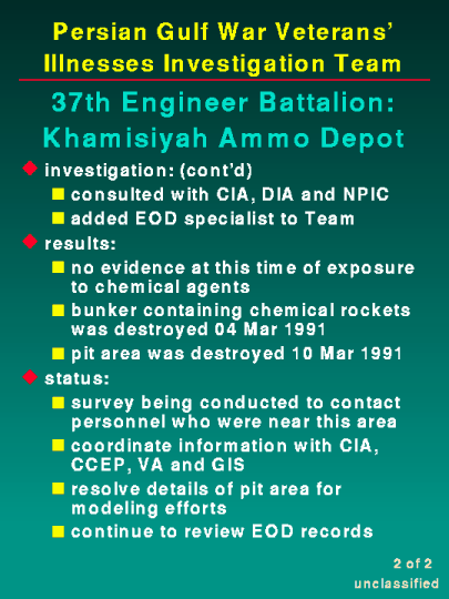 Efforts to solidify information on the units located at the Khamisiyah ammunition depot are still ongoing. Through our interview of eyewitnesses and operational unit logs, we have been able to ascertain many of the additional units in the immediate area. CIA has modeled exposure limits for this site. A worst case analysis indicates that a potential agent release from bunker 73 would result in an area of approximately 25 kilometers in a general east-by-northeasterly direction not meeting the safe level of continuous human exposure for 72-hours. After identifying the units who were directly involved in the demolition operation at Khamisiyah, we have contacted over 60 members of the 37th Engineering Battalion and traveled to Fort Bragg, North Carolina to interview key personnel still on active duty. We have enlisted the efforts of an Army Explosive Ordnance Disposal (EOD) specialist who is currently assisting in the analysis of operational records and unit logs of the various EOD teams deployed to the Persian Gulf. This addition of an EOD specialist may also aid in the possible identification of other ammunition storage sites which may have also contained chemical munitions. This case file investigation on EOD activities will be fruitful in clarifying the question of whether or not there are other "Khamisiyahs" existing in the theater of operation.
