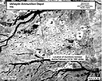 Once it was assessed that the mustard-filled rounds inspected at the Fallujah Proving Ground in 1991 were at Ukhaydir during the Gulf War, the intelligence community concluded that the damage discovered at the Fallujah Proving Ground might have occurred while the rounds were at Ukhaydir.[30] In 1997, after UNSCOMs first Ukhaydir inspection, but before its second, the intelligence community examined the available information to determine how the rounds became empty and when the damage could have taken place and whether any mustard agent that may have been released reached US forces located in Saudi Arabia. After an extensive investigation, which included a review of photography from the Gulf War, the intelligence community determined that Iraq stacked the mustard-filled rounds in the open in several areas throughout the Ukhaydir Ammunition Storage Depot. They placed one large stack directly in front of the fenced bunker later inspected by UNSCOM. (See Figure 9.[31] ) The intelligence community believes the damaged and empty munitions inspected at the Fallujah Proving Ground were in this stack. As the intelligence community noted, "other similar stacks were located in the open at various locations in the depot, but no other stacks were damaged."[32] The intelligence community also assessed in 1997 that it was possible no rounds were damaged at Ukhaydir during the Gulf War. However, since some rounds were damaged at some time, the damage could have occurred during two separate Coalition air strikes on Ukhaydir, the first on January 20, 1991, and the second on the night of February 13/14, 1991.[33,34]