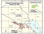 The CIA presented its preliminary modeling results for the February strike at a hearing of the Presidential Advisory Committee on Gulf War Veterans Illnesses on September 4, 1997. Given the source characteristics and the weather conditions at the time of the release, the CIAs modeling produced a hazard area of contamination above the general population limit extending approximately 125 kilometers toward the southwest. The modeling showed the hazard areas maximum width would have been between 10 and 20 kilometers.[49] (See Figure 14.)